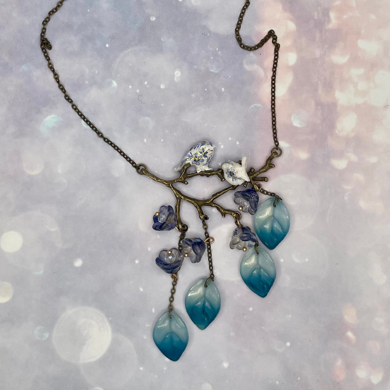 Fleurs et feuilles de verre accompagnent deux petits oiseaux sculptés en porcelaine froide.